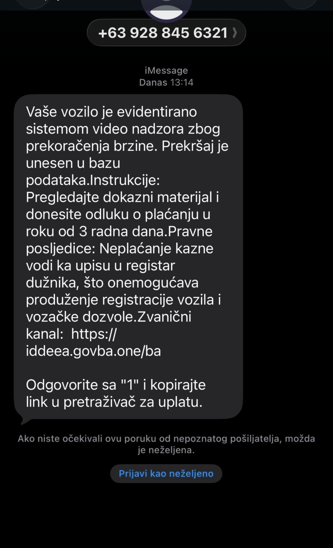 U zaprimljenim porukama navodi se da je vozilo evidentirano sistemom video-nadzora zbog prekoračenja brzine te se od građana traži da u kratkom roku izvrše uplatu, uz navođenje mogućih pravnih posljedica. U poruci se nalazi poveznica koja vodi na sumnjive internet stranice.