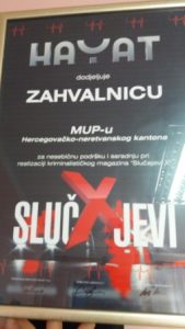 Od strane TV “Hayat” Ministarstvo unutarnjih poslova HNŽ i Policijska postaja Mostar-Centar dobili su zahvalnice za pružanje nesebične potpore, zalaganja i suradnje prilikom realizacije kriminalističkog magazina “Slučajevi X”.